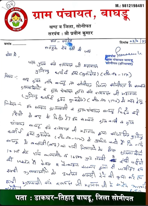 संत रामपाल जी महाराज की ओर से ग्राम पंचायत बाघडू को एक ‘विशेष निवेदन पत्र’ भी सौंपा गया, जिसमें उनकी सेवा की पारदर्शिता और अनुशासन की झलक मिलती है। निवेदन में स्पष्ट किया गया है कि गाँव का पानी जल्द से जल्द निकलना चाहिए ताकि अगली फ़सल की बिजाई हो सके। पत्र में साफ़ चेतावनी दी गई है कि “यदि संत रामपाल जी महाराज जी द्वारा दी गई राहत सामग्री से निर्धारित समय पर पानी नहीं निकलता है और इस बार फसल की बिजाई नहीं हुई तो आगे से हमारा ट्रस्ट आपके गाँव की कोई मदद नहीं करेगा।” यह शर्त ग्रामवासियों को एकजुट होकर तुरंत कार्रवाई करने के लिए प्रेरित करती है। इस पत्र में सेवा की पारदर्शिता सुनिश्चित करने के लिए एक अद्वितीय उपाय भी बताया गया है। संत जी के आदेशानुसार: