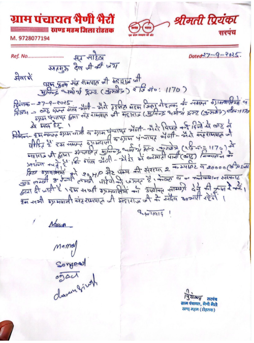 संत रामपाल जी महाराज की ओर से ग्राम पंचायत को एक विशेष निवेदन पत्र दिया गया।