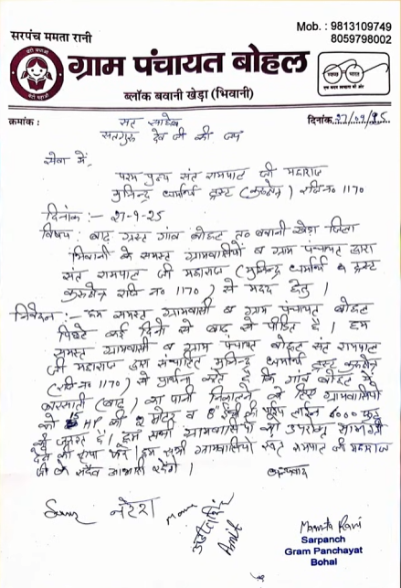 तभी ग्रामीणों को पता चला कि संत रामपाल जी महाराज के नेतृत्व में अन्नपूर्णा मुहिम के तहत बाढ़ प्रभावित गांवों में राहत कार्य चल रहे हैं। उन्होंने पड़ोसी गांवों से सुना कि संत जी के आदेश पर जहां भी आपदा आती है, वहां समय रहते सहायता पहुंचती है। इसी विश्वास के साथ सरपंच रविंद्र कुमार जी के नेतृत्व में बोहल गांव की पूरी पंचायत बरवाला पहुंची और संत रामपाल जी महाराज के चरणों में प्रार्थना पत्र प्रस्तुत किया।