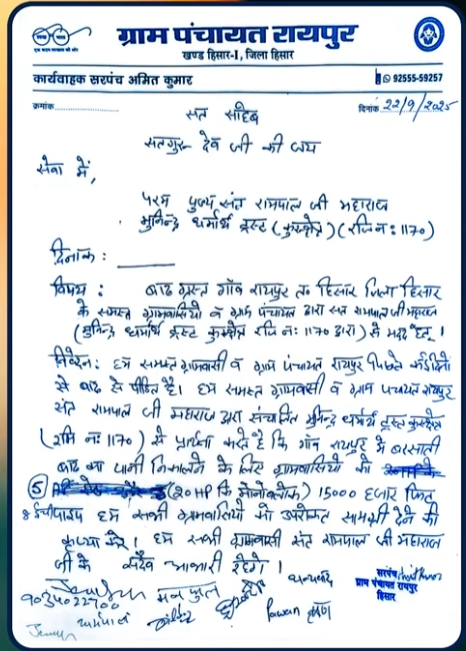 राहत सामग्री सौंपने के बाद, जगत गुरु संत रामपाल जी महाराज का एक विशेष निवेदन पत्र ग्राम पंचायत रायपुर को दिया गया। इस पत्र में संत रामपाल जी महाराज का किसानों के प्रति समर्पण और उनकी भलाई के लिए सख्त निर्देश निहित थे।