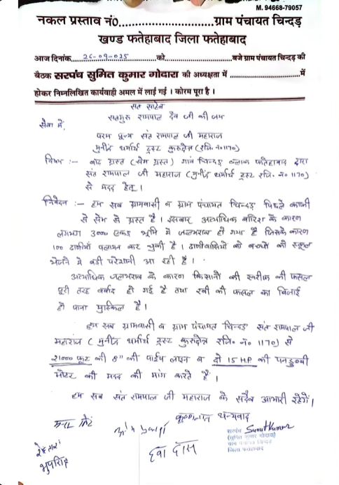 सरपंच सुमित कुमार गोदारा के नेतृत्व में पंचायत ने बरवाला में संत रामपाल जी महाराज को प्रार्थना पत्र सौंपा, जिसमें 21,000 फुट 8 इंची पाइप और दो 15 HP पनडुब्बी मोटर की मांग थी, ताकि पानी को 7 किमी दूर फतेहाबाद और किशनगढ़ ब्रांच नहरों तक ले जाया जाए। चार दिन के भीतर प्रार्थना स्वीकार हो गई। ट्रस्ट ने भारी मात्रा में सामग्री जुटाई और 8-10 ट्रकों का काफिला चिंदड़ पहुंचा, जिसमें उच्च गुणवत्ता वाले पाइप, मोटर, स्टार्टर, केबल, और “सुई से लेकर मोर्टार” तक का सामान था।
