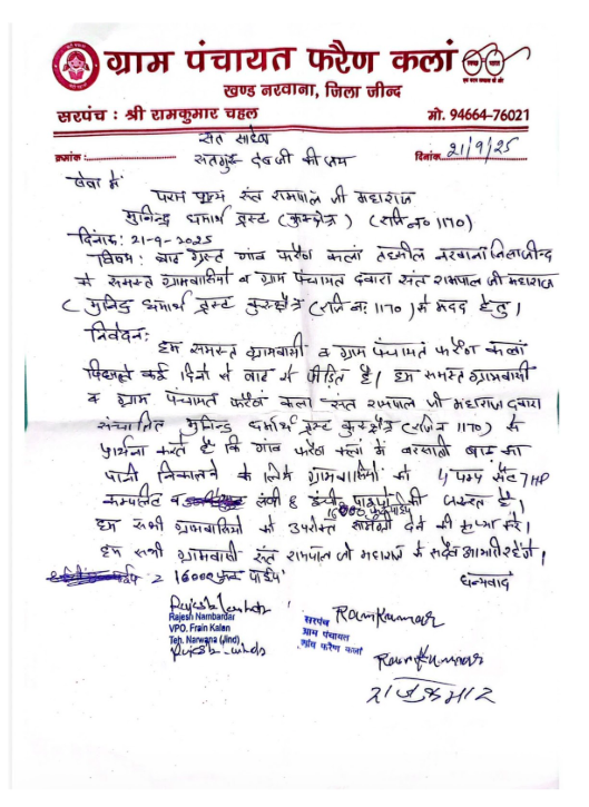 संत रामपाल जी महाराज के आदेश पर राहत सामग्री का एक विशाल काफिला फरैण कलां गांव में भेजा गया। इस सामग्री में चार बड़ी मोटरें, 16,000 फुट की उच्च गुणवत्ता वाली पाइप लाइन, स्टार्टर, 1000 फुट केबल और मोटर चलाने के लिए आवश्यक सभी उपकरण शामिल थे। यह सुनिश्चित किया गया कि ग्रामीणों को किसी भी तरह की परेशानी का सामना न करना पड़े।