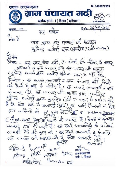 जब सारे प्रयास निष्फल होने लगे, तब ग्रामीण लोग, सरपंच और ग्राम पंचायत के अन्य सदस्य संत रामपाल जी महाराज से प्रार्थना करने के लिए पहुंचे और 14,000 फीट पाइप और 3 यूनिट मोटर (प्रत्येक 15 HP) की मांग रखी। संत रामपाल जी महाराज “अन्नपूर्णा मुहिम” के अंतर्गत बाढ़ प्रभावित इलाकों में निःस्वार्थ राहत कार्य कर रहे हैं।