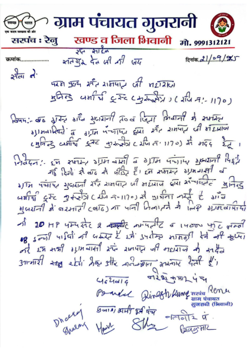 जब हर तरफ से निराशा हाथ लगी, तब ग्राम पंचायत ने संत रामपाल जी महाराज से मदद की गुहार लगाई। उन्होंने 20 हॉर्स पावर की दो मोटरें और 14,000 फुट पाइप की मांग की।