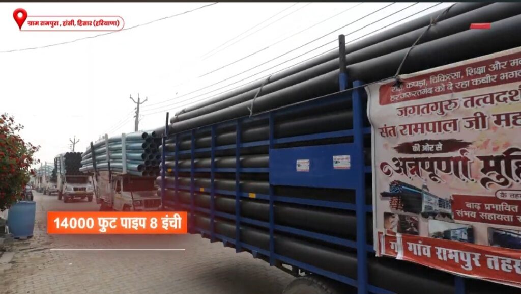 हरियाणा के हांसी जिले के रामपुरा गांव में भीषण बाढ़ से भारी नुकसान हुआ था। खेतों में लंबे समय तक जलभराव और प्रशासनिक स्तर पर त्वरित राहत न मिलने की स्थिति में ग्रामीणों ने सहायता के लिए तत्त्वदर्शी संत रामपाल जी महाराज से संपर्क किया। अपील के बाद गांव को 8 इंच व्यास की 14,000 फीट पाइपलाइन, दो 10 हॉर्सपावर की मोटर और सभी आवश्यक फिटिंग उपलब्ध कराई गईं, ताकि बाढ़ का पानी निकाला जा सके और अगली फसल की समय पर बुवाई सुनिश्चित हो सके। यह सामग्री पूर्ण, उपयोग के लिए तैयार समाधान के रूप में ग्राम पंचायत को औपचारिक रूप से सौंपी गई। इस दौरान ग्रामीणों, सेवानिवृत्त पुलिसकर्मियों और पूर्व सैनिकों ने इस प्रयास को अनुशासित, जवाबदेह और सेवा-भाव से प्रेरित बताया।