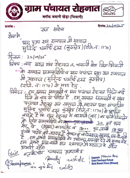इसके पश्चात ग्राम पंचायत के प्रतिनिधि दल ने बरवाला स्थित संत रामपाल जी महाराज के अनुयायियों से भेंट की और एक प्रार्थना पत्र सौंपा। पत्र में गांव से पानी निकासी के लिए दो बड़ी 20 हॉर्स पावर की मोटरें और 12,000 फुट लंबी 8 इंची पाइप की मांग की गई थी, ताकि गांव को बाढ़ की त्रासदी से मुक्त किया जा सके।