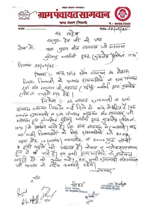 उन्होंने बरवाला जाकर संत जी के अनुयायियों को एक प्रार्थना-पत्र सौंपा। उनकी अपील स्पष्ट और तत्काल थी: उन्हें अपने गाँव से रुके हुए पानी को निकालकर दूर एक ड्रेन में डालने के लिए 10 उच्च-शक्ति वाले 20 हॉर्स पावर की मोटर और 20,000 फीट ड्रेनेज पाइप की आवश्यकता थी। यही उनके लिए ठीक होने की लंबी राह पर पहला कदम उठाने का एकमात्र मौका था।