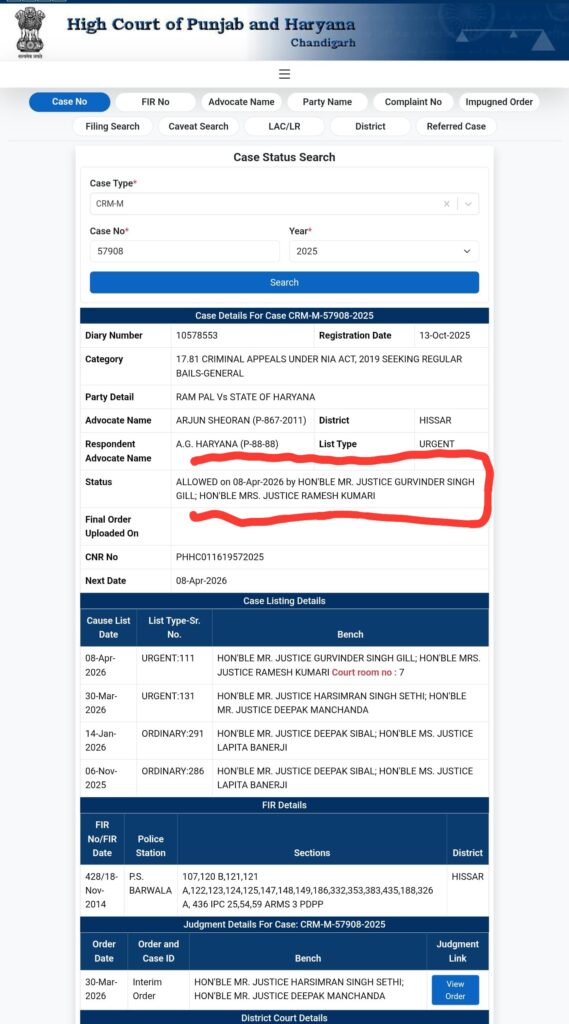 As per the official court portal, on April 8, 2026, the bench declared the bail plea as “ALLOWED.” Sant Rampal Ji Maharaj was represented by Advocate Arjun Sheoran (P-867-2011), while the State of Haryana was represented by the Advocate General (P-88-88).