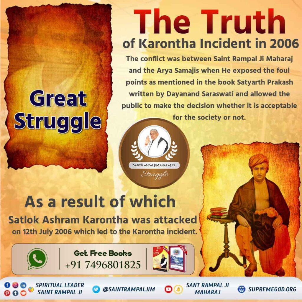 Sant Rampal Ji Maharaj publicly challenged certain interpretations in Satyarth Prakash based on Vedic references, encouraging independent verification from readers. This led to discontent among sections of Arya Samaj. On July 12, 2006, a large mob attacked Satlok Ashram in Karontha, resulting in one death. Despite police inaction, charges were filed against Sant Rampal Ji, leading to His arrest. A demand for a CBI inquiry was not entertained, and He was granted bail in 2008.