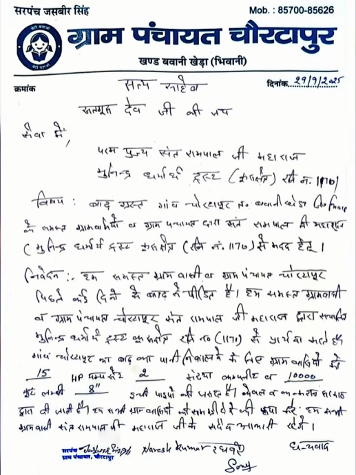 गांव के सरपंच रमेश कुमार और पंचायत ने बरवाला जाकर मुनिंदर धर्मार्थ के सेवादारों से सतगुरु रामपाल जी महाराज से मदद करने की गुहार लगाई। उन्होंने मैनेजमेंट को एक प्रार्थना पत्र सौंपा, जिसमें स्पष्ट रूप से मांगा गया था: