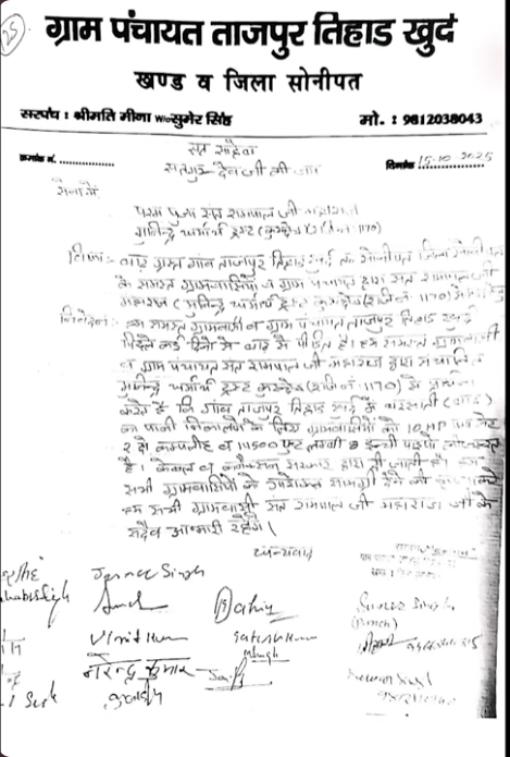 हरियाणा के सोनीपत जिले के ताजपुर तिहाड़ा खुर्द गाँव में भी इस बार बाढ़ ने तांडव म्चाया था। लगभग 300–400 एकड़ जमीन जलमग्न रही, एक फसल तो पूरी तरह बर्बाद हो चुकी थी और दूसरी — गेहूं की बुवाई — की उम्मीद भी धुँधली दिख रही थी। सरकारी प्रयास असफल रहे। सभी दरवाजे बंद दिखे तो ग्राम पंचायत ने अपनी अंतिम उम्मीद लेकर संत रामपाल जी महाराज से मदद की प्रार्थना की। सरपंच एवं पंचायत प्रतिनिधियों ने बरवाला स्थित आश्रम में प्रार्थना-पत्र सौंपा — जिसमें 14,500 फुट (या प्रार्थना में 14,000–14,500 फुट) पाइप और दो बड़ी मोटर की मांग की गई।