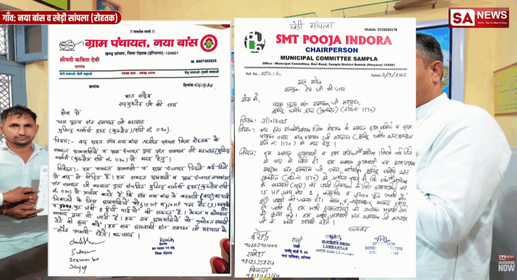 सरकारी मदद की उम्मीद टूटने के बाद, दोनों ग्राम पंचायतों ने संयुक्त रूप से जगतगुरु संत रामपाल जी महाराज के बरवाला स्थित ट्रस्ट ऑफिस जाकर सहायता मांगने का निर्णय लिया। दोनों गाँवों के सरपंच प्रतिनिधि और गणमान्य नागरिक एक प्रार्थना पत्र लेकर बरवाला पहुँचे, जिसमें उन्होंने कुल 10,000 फुट पाइपलाइन और तीन उच्च क्षमता वाली मोटरों की मांग की: एक 15 हॉर्स पावर की मोटर और दो 10 हॉर्स पावर की मोटरें।